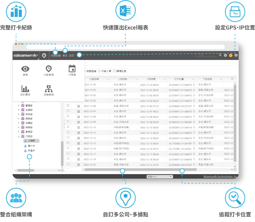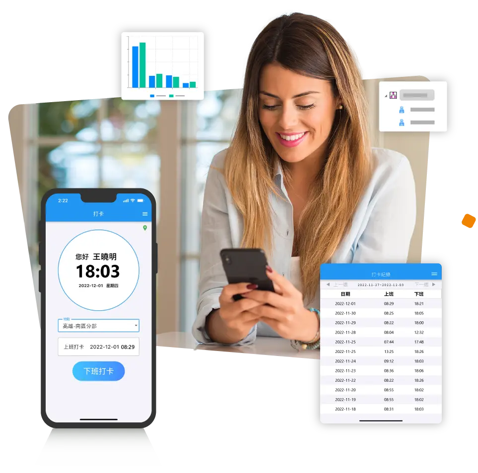 打卡、定位紀錄即時回傳後台系統,管理者隨時掌握出勤狀況